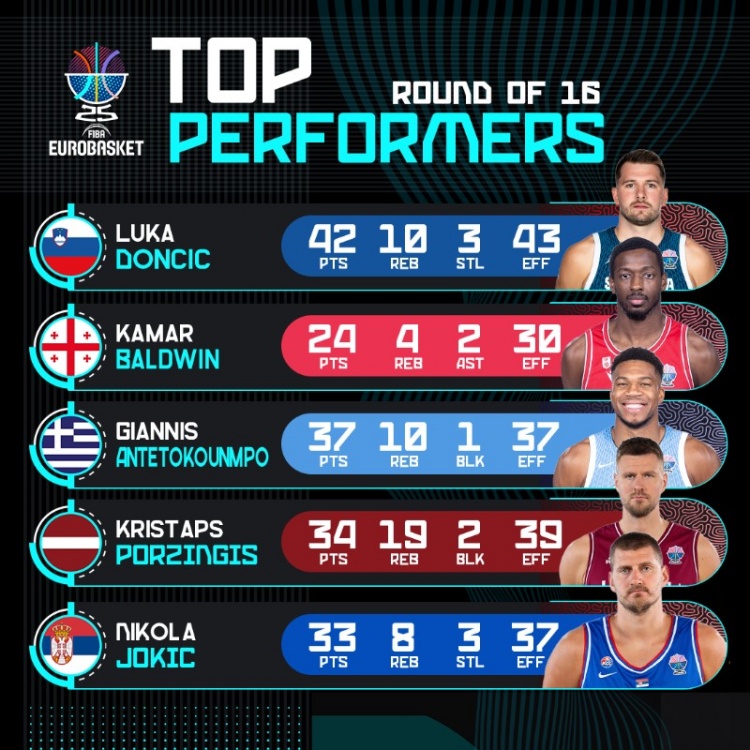 Giải vô địch châu Âu chính thức Triển lãm nổi bật của 16 người chơi hàng đầu: Doncic 42+10 Thư 37+10 Pozin 34+19