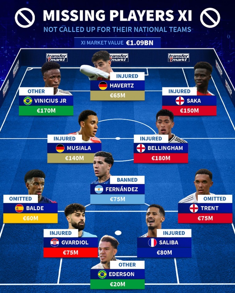 Chuyển sang danh sách của Đức không có trong đội hình nhóm quốc gia: Vinicius và Musiara nằm trong danh sách, với tổng giá 1,09 tỷ euro